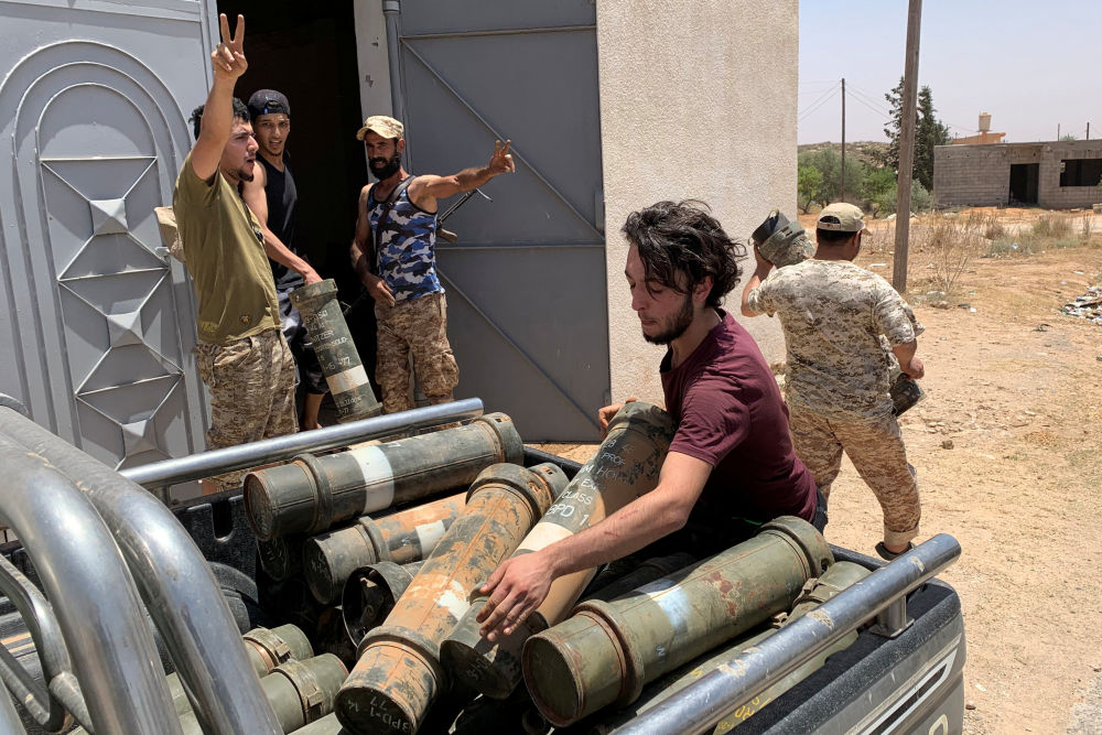 6月5日,利比亞民族團(tuán)結(jié)政府武裝人員在奪回泰爾胡奈市后搬運沒收的武器。(新華社/路透)