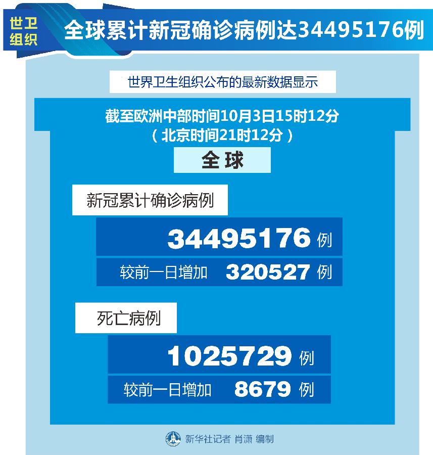 世衛(wèi)組織網站最新數(shù)據顯示,截至歐洲中部時間3日15時12分(北京時間21時12分),全球確診病例較前一日增加320527例,達到34495176例;死亡病例增加8679例,達到1025729例。