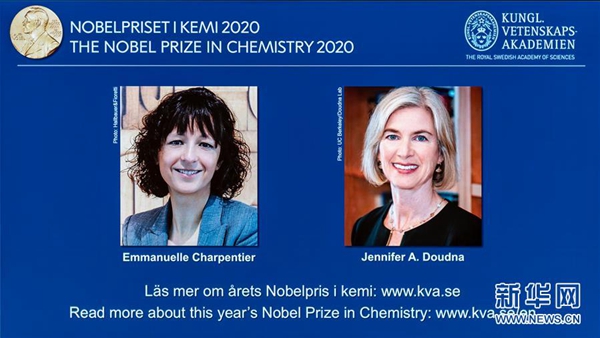 10月7日,在瑞典斯德哥爾摩,瑞典皇家科學(xué)院諾獎宣布現(xiàn)場電子屏幕上顯示兩位獲獎的女科學(xué)家。新華社發(fā)(魏學(xué)超 攝)