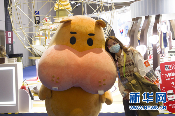 觀眾在第三屆進(jìn)博會(huì)上的食品及農(nóng)產(chǎn)品展區(qū)與人偶合影(11月5日攝)。新華網(wǎng) 吳一航 攝