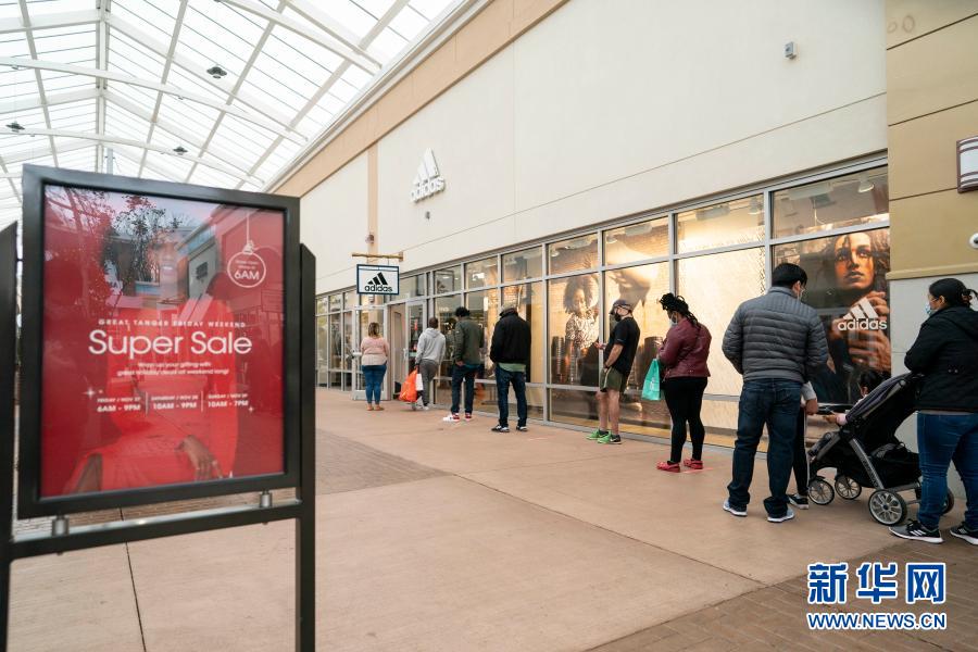 11月27日,人們?cè)诿绹?guó)馬里蘭州國(guó)家港灣一處購物中心排隊(duì)等待進(jìn)店購物。