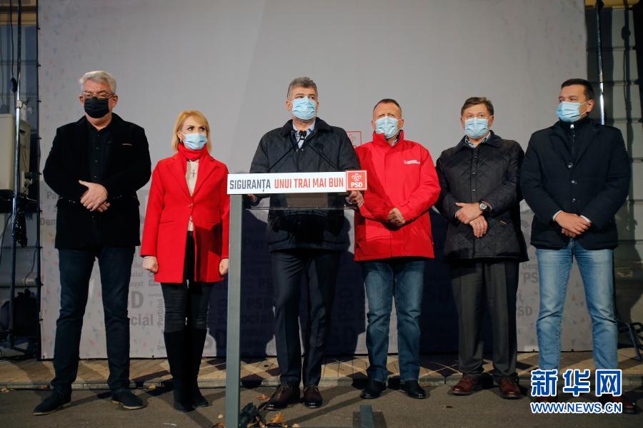 12月6日,在羅馬尼亞首都布加勒斯特,羅馬尼亞最大反對黨社會民主黨主席喬拉庫(左三)向媒體發(fā)表講話。新華社發(fā)(克里斯泰爾攝)