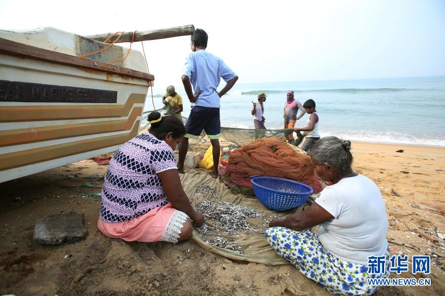 12月12日,在斯里蘭卡首都科倫坡附近的莫勒圖沃,漁民在海邊分揀捕獲的魚。