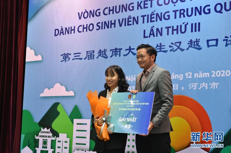 12月13日,在越南首都河內(nèi)舉行的第三屆越南大學(xué)生漢越口譯大賽決賽現(xiàn)場,冠軍阮氏明書(左)接受頒獎(jiǎng)。新華社記者 蔣聲雄 攝