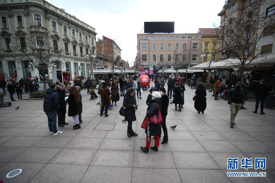 12月29日,在克羅地亞首都薩格勒布,人們?cè)诘卣鸷缶奂谑兄行牡囊惶帍V場(chǎng)。新華社發(fā)(Pixsell圖片社 烏魯卡洛維奇攝)