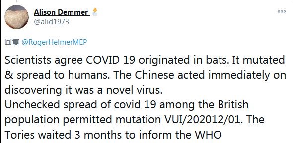 還有一名網(wǎng)友對比稱:“科學(xué)家同意新冠病毒起源自蝙蝠,變異后傳播給人類,中國人發(fā)現(xiàn)這是一種新病毒后,立即采取了行動。新冠病毒在英國人口中無限制的傳播,導(dǎo)致了變異新冠病毒(VUI/202012/01),保守黨等了3個月才通知世衛(wèi)組織?!?/p>