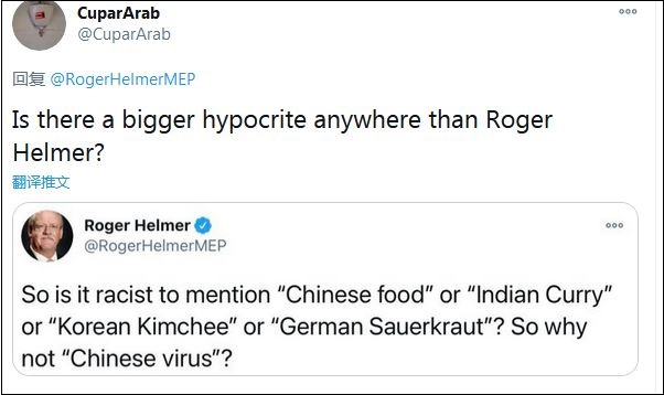 不料,這條評論徹底“翻車”。赫爾默是一名英國獨立黨成員,政治立場偏保守,批評英國的國家醫(yī)療服務(wù)體系(NHS),并否定歐盟的氣候政策。過去一年間,他曾多次將新冠病毒污蔑為“中國病毒”,還曾轉(zhuǎn)發(fā)過特朗普的相關(guān)視頻。