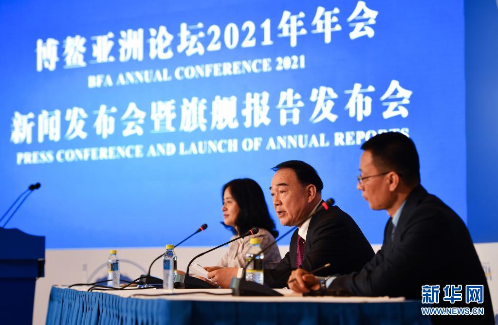 4月18日,博鰲亞洲論壇秘書(shū)長(zhǎng)李保東(右二)在新聞發(fā)布會(huì)上講話。