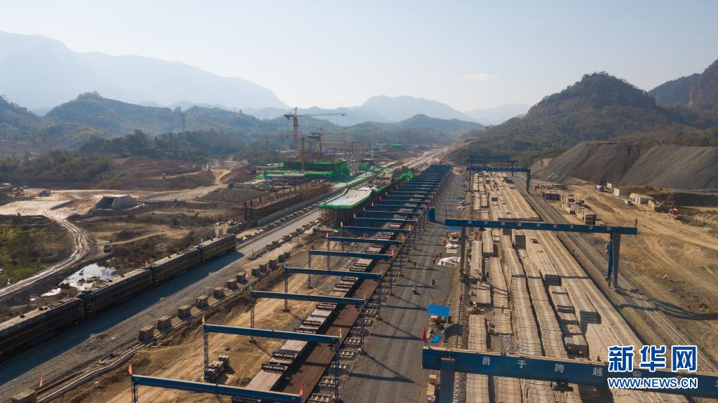 這是2020年12月29日在老撾瑯勃拉邦拍攝的中老鐵路瑯勃拉邦車站鋪軌現場(航拍照片)。新華社發(fā)(老中鐵路有限公司供圖)