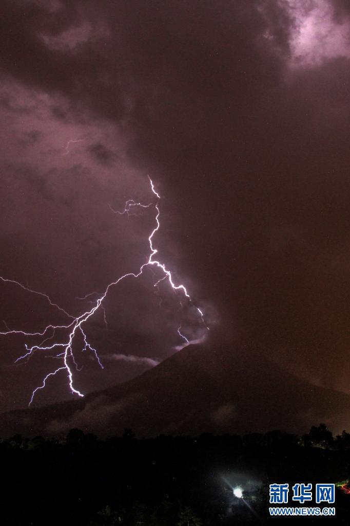 這是5月13日在印度尼西亞北蘇門答臘省拍攝的錫納朋火山上空的閃電(長(zhǎng)時(shí)間曝光照片)。