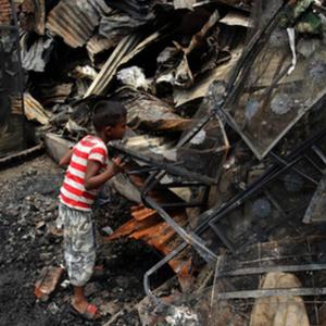 6月7日,一名兒童在孟加拉國首都達卡發(fā)生火災的貧民窟廢墟中尋找個人物品。