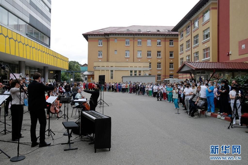 當(dāng)日,羅馬尼亞首都布加勒斯特一個(gè)樂(lè)隊(duì)在該國(guó)一家傳染病醫(yī)院——馬太·巴爾什醫(yī)院演出,向抗擊新冠疫情的醫(yī)務(wù)工作者致謝。